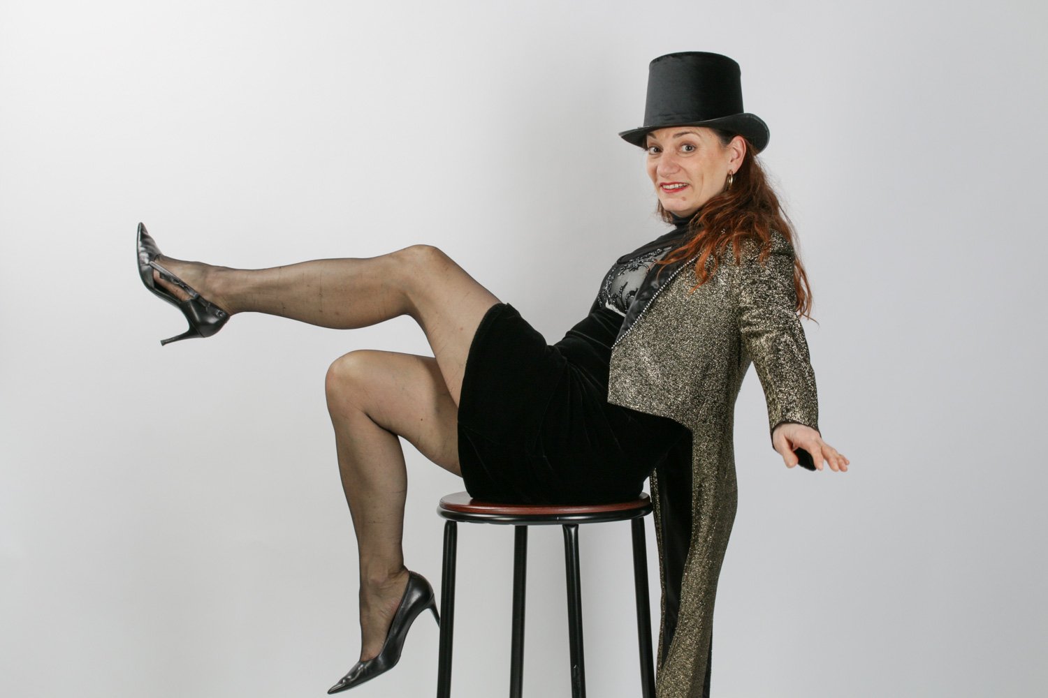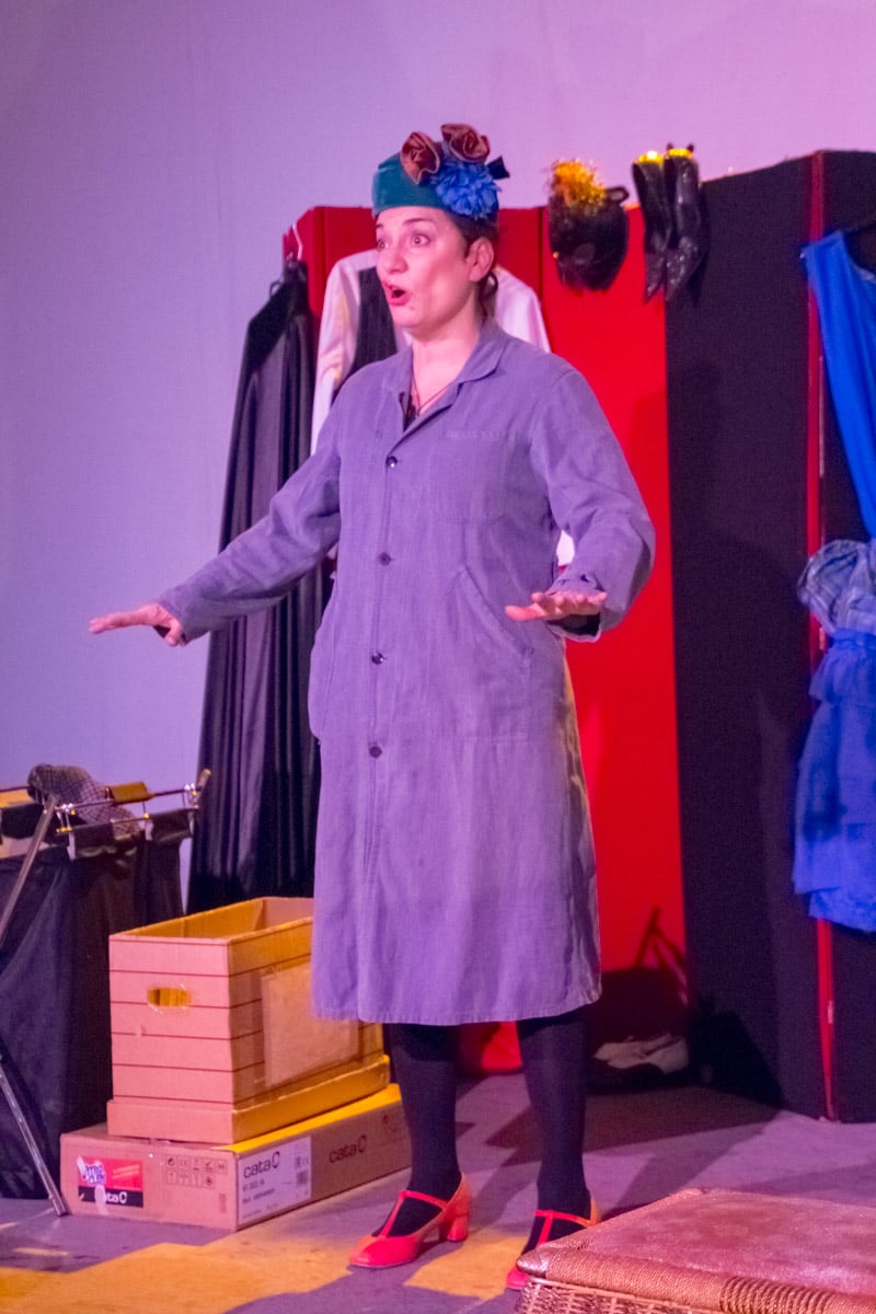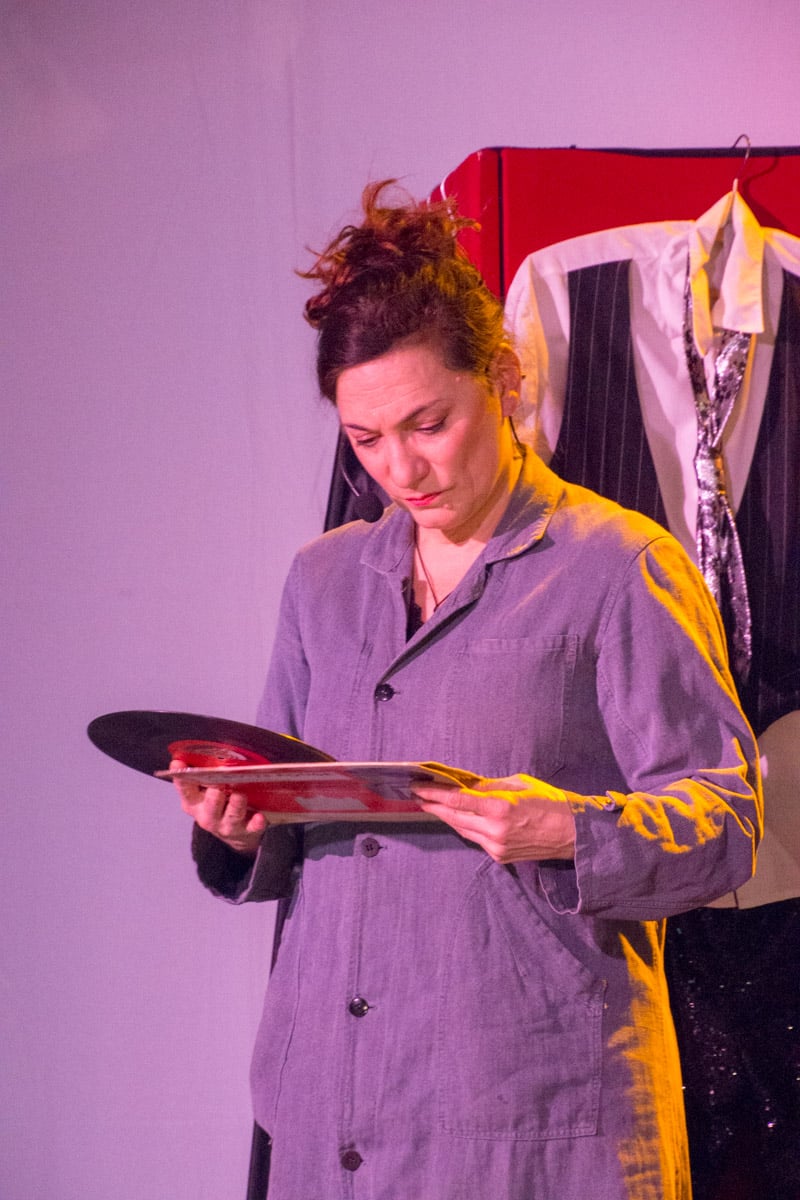 Elle est à la fois les chanteurs, le meneur de jeu qui raconte, qui présente …Elle endosse des costumes, joue avec des accessoires …ces éléments l’aident à se sentir l’espace d’une heure la grande vedette du Cabaret