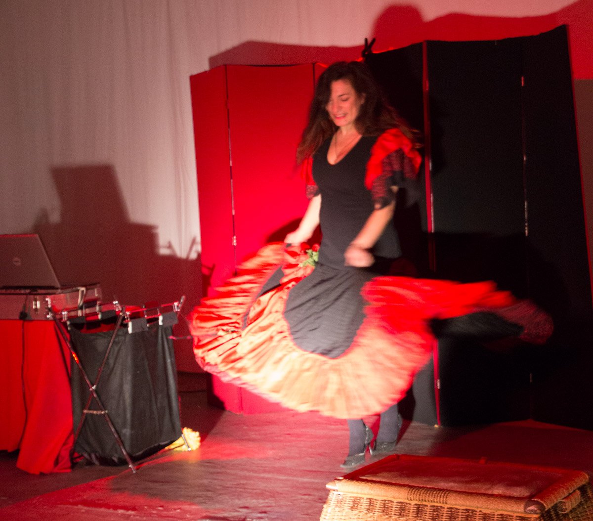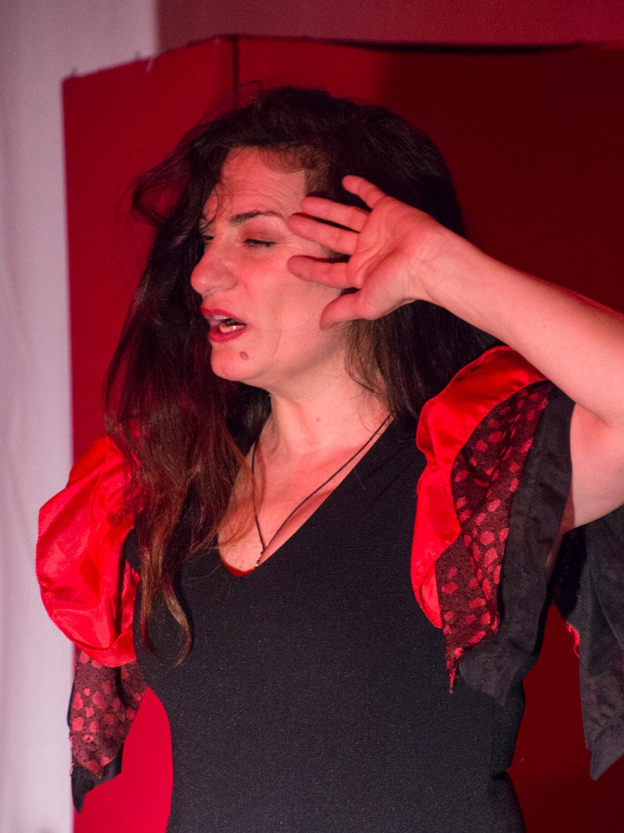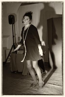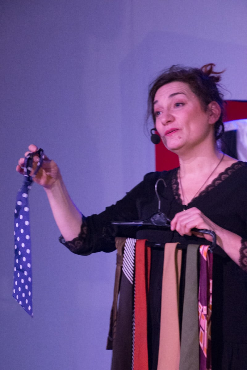 Elle est à la fois les chanteurs, le meneur de jeu qui raconte, qui présente …Elle endosse des costumes, joue avec des accessoires …ces éléments l’aident à se sentir l’espace d’une heure la grande vedette du Cabaret